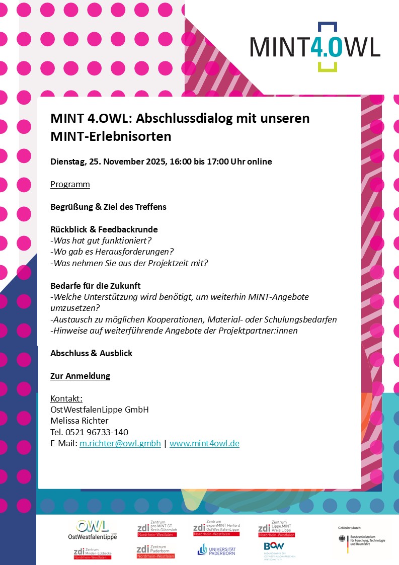 Anmeldung unter https://www.ostwestfalenlippe.de/projekte/mint-community-4owl/mint-4owl-abschlussdialog-mit-unseren-mint-erlebnisorten/25-11-2025/
